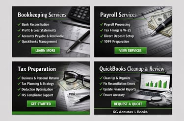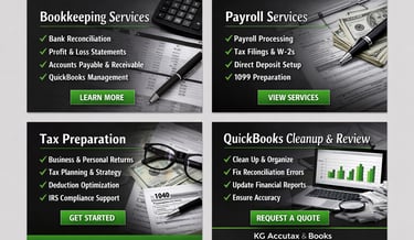 At KG Accutax & Books, we understand that managing your finances takes valuable time away from running your business. Our goal is to provide reliable bookkeeping, payroll, and tax services so you can focus on growing your company.